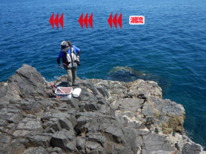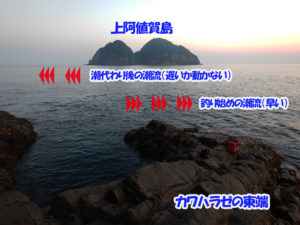 釣り始めは右方向にいい感じで流れていた潮。すぐにイサキ(25cmくらい)があたりだす
