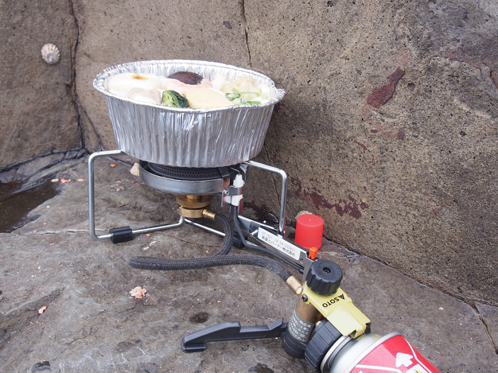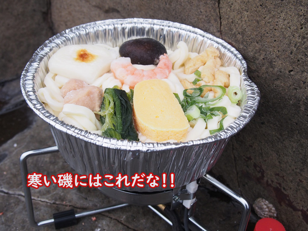 磯の上で冷凍の鍋焼きうどんに火を入れる。