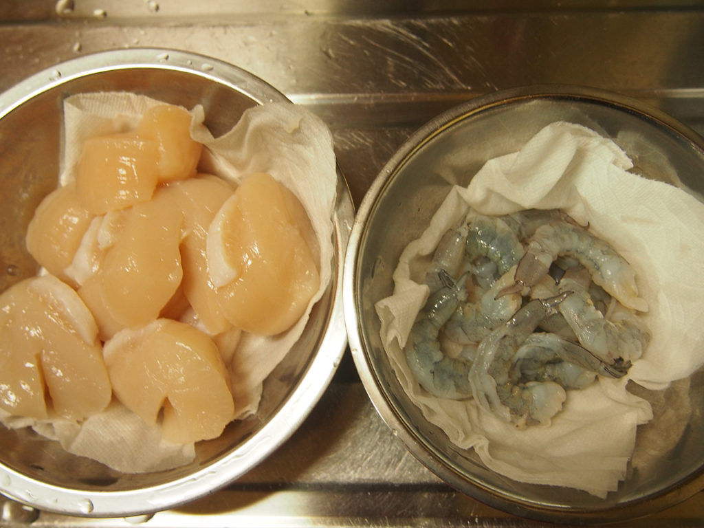 ホタテ君や海老様が固くならないように、弱火でゆっくりと火を通していく。