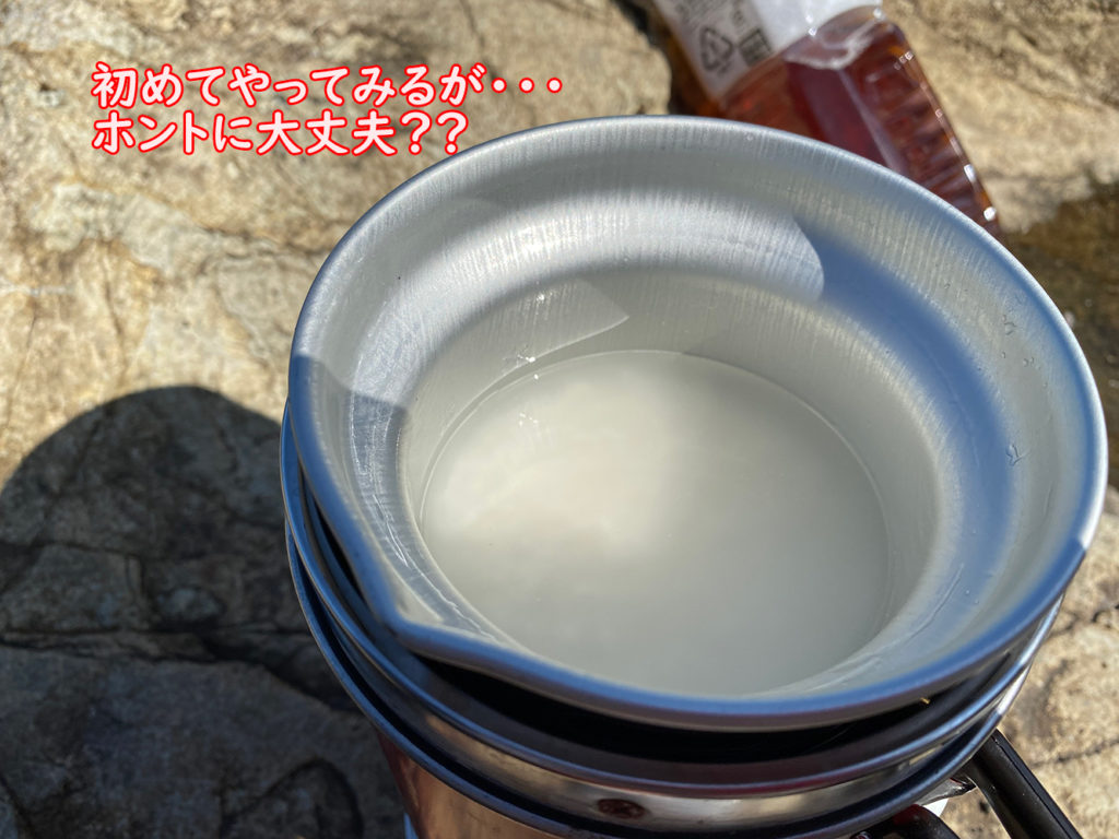 お焦げまみれのアルポットに、再び水を注ぎ沸騰させ、レトルトカレーを温める。