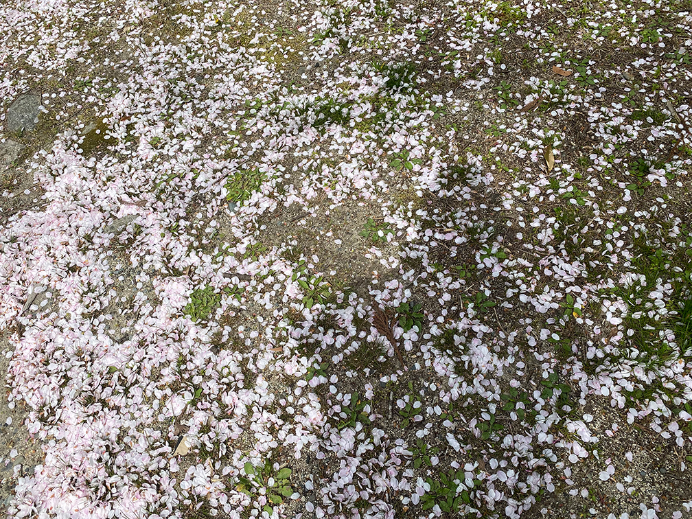 土手には散った桜の花びらの絨毯。