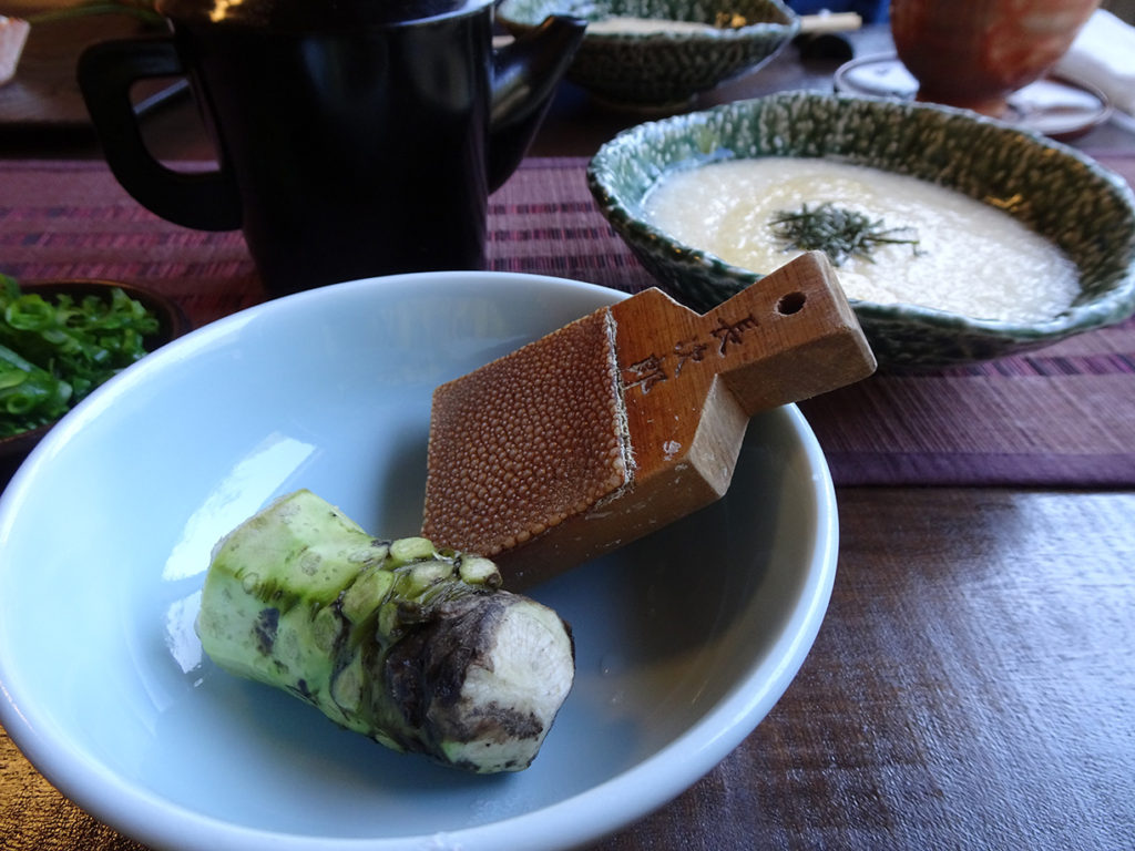 山葵の向こうに見えるのは、にわ子が頼んだとろろ蕎麦についてきたとろろ。