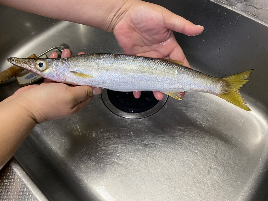 カマスは丸々としていて、脂ののりも良さそうなので梅肉と大葉を挟み、刺身で食うかな。