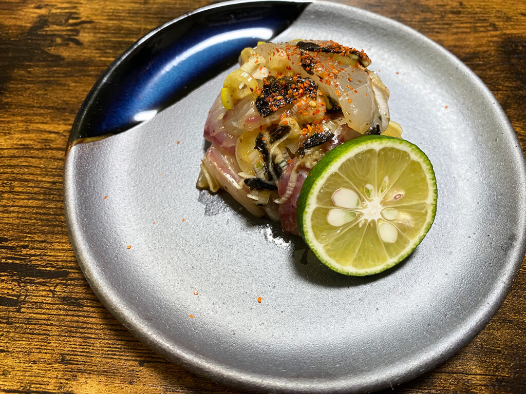 これは『チョレギタレ』と白ネギ、そして韓国海苔を和えたカルパッチョ?である。