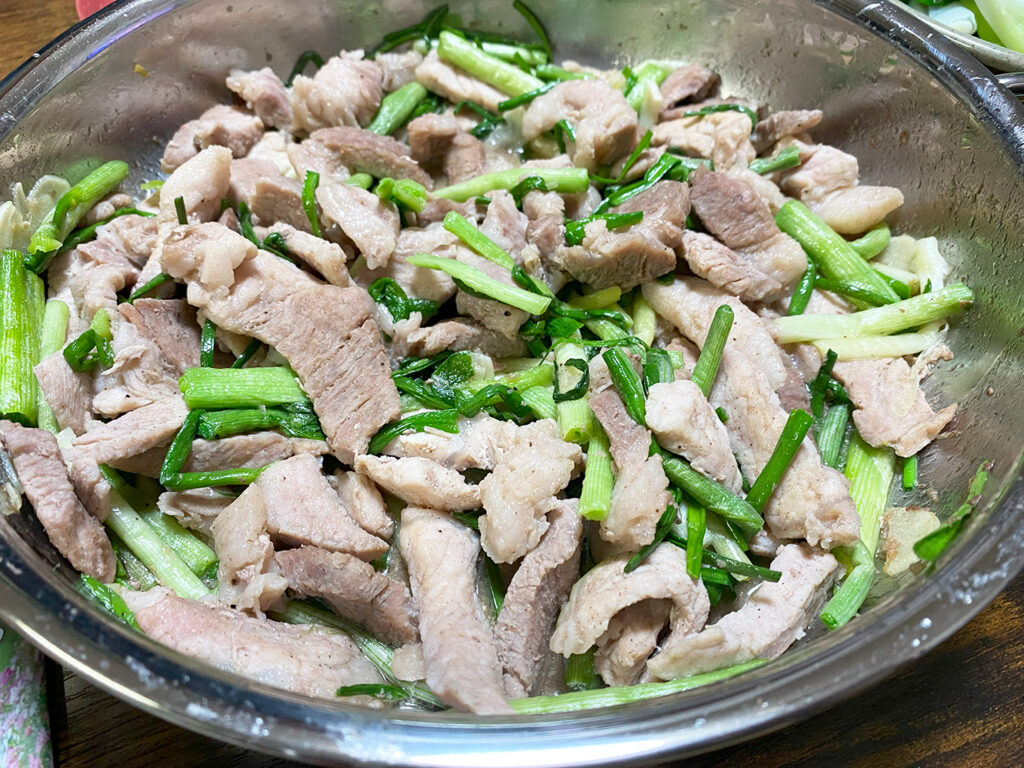 豚肉とのびるの相性は抜群である。味付けは塩コショウのみで十分。豚肉の甘さとのびるの辛味、そしてのびるのシャキシャキとした食感が口の中で踊る、踊る!!たまりましぇーーーん!!