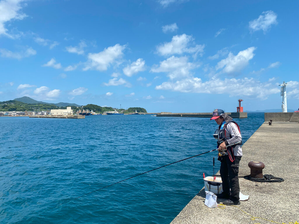 この日の生月の状況は、風が少し強くて、W氏の釣り座からすると、右から左へと強い風が吹く感じ。なので、道糸がふけて少々釣り辛い状況だ。