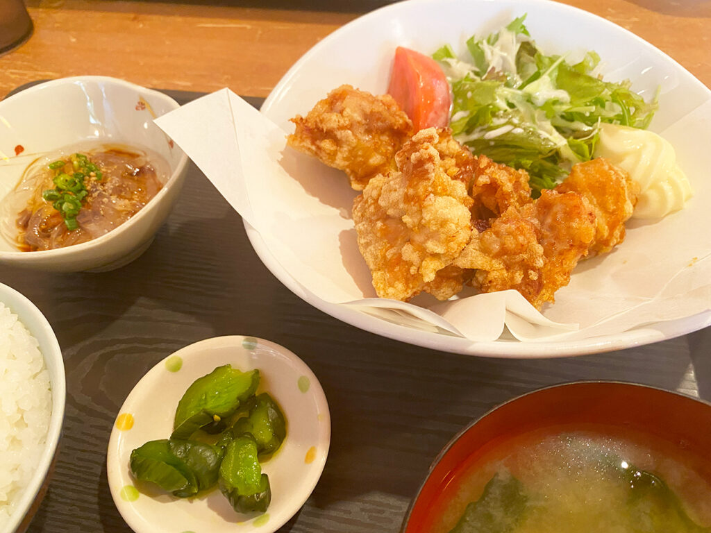 ワシは海鮮丼を、にわ子はどうしても食いたかったという唐揚げ定食を注文。